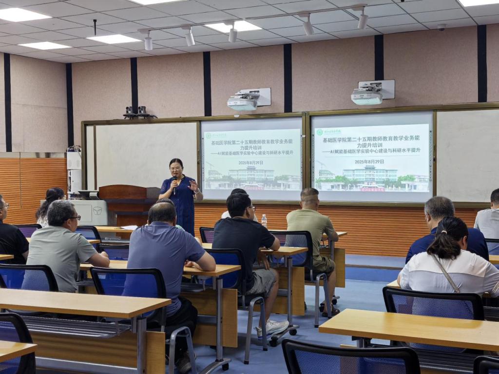 本次培训首先由主讲人覃艳春老师以亲身经历为线索,分享了从科研“门外汉”到指导员工参与国家级竞赛的蜕变历程,为实验教辅老师提供了宝贵的科研成长范本。随后,王金花老师则以“AI技术驱动实验教学创新”为主题,围绕AI赋能下的基础医学实验中心建设和科研水平提升与现场老师进行分享和探讨,各中心的老师也分享了人工智能在虚拟仿真教学、实验结果分析、员工作业管理及科研项目管理中的应用场景,并提出通过智能化平台建设推动实验资源开放共享,为提升基础医学实验教学和科研创新水平提供了新思路。